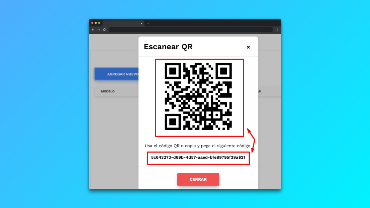 Se generará automáticamente un código QR y un código alfanumérico único en pantalla.
