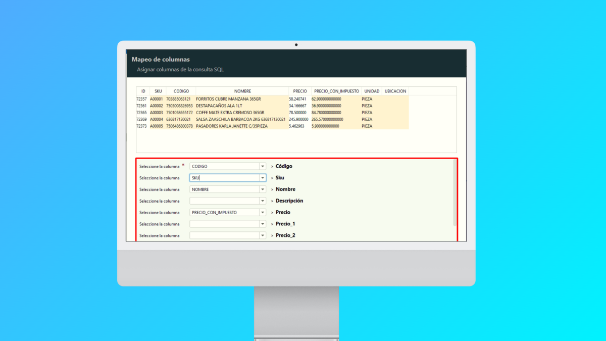 Mapeamos las columnas del catálogo de productos de la Codaly con las columnas obtenidas de nuestra consulta SQL.