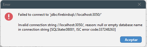 ⚠️Error: Invalid connection string //localhost:3050/, reason: null or empty database name in connection string [SQLState:08001, ISC error code:337248263]