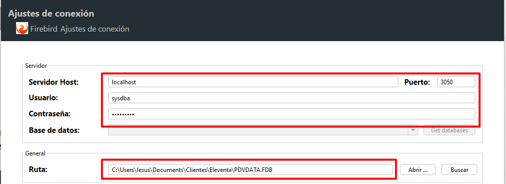 💡 Causa común: Este problema se debe a que no se ha ingresado la ruta de la base de datos del servidor Firebird.