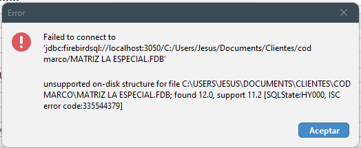 ⚠️Error: unsupported on-disk structure for file C:\USERS\JESUS\DOCUMENTS\CLIENTES\COD MARCO\MATRIZ LA ESPECIAL.FDB; found 12.0, support 11.2