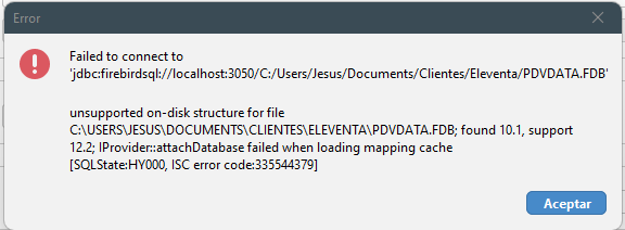 ⚠️Error: unsupported on-disk structure for file C:\USERS\JESUS\DOCUMENTS\CLIENTES\ELEVENTA\PDVDATA.FDB; found 10.1, support 12.2; IProvider::attachDatabase failed when loading mapping cache [SQLState:HY000, ISC error code:335544379]